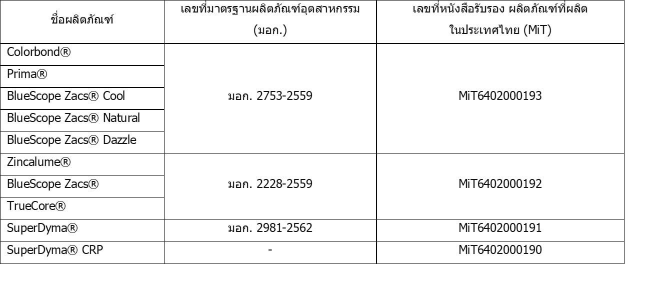 ผลิตภัณฑ์บลูสโคป แซคส์และจิงโจ้เหล็ก นั้นจะมีการแสดง ชื่อผลิตภัณฑ์ รุ่น ความหนา อยู่ด้านบนของผลิตภัณฑ์ ทุกระยะ 2 เมตร อีกด้วย